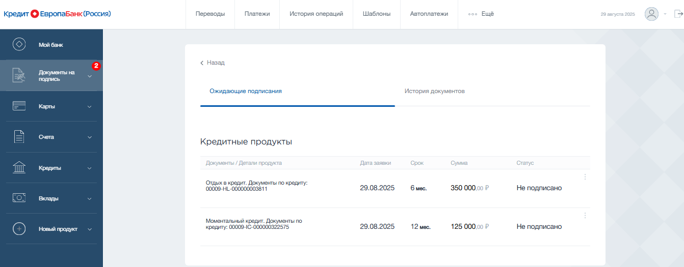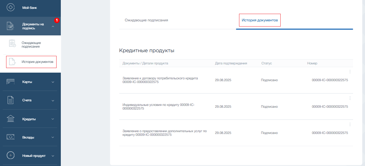 В разделе «Одобренные кредиты» – кредиты, одобренные банком и готовые к подписанию (можно оформить онлайн и подписать электронно). Вы можете подать заявку на кредит через отделение, через мобильное приложение или через курьера (в зависимости от типа кредита). Раздел активен, если есть одобренные кредиты.