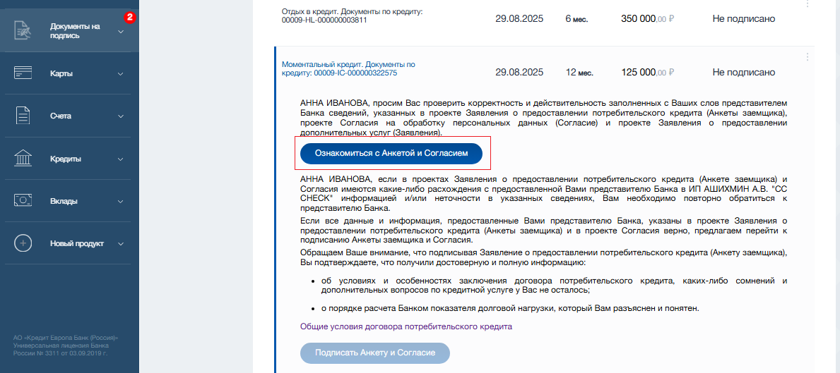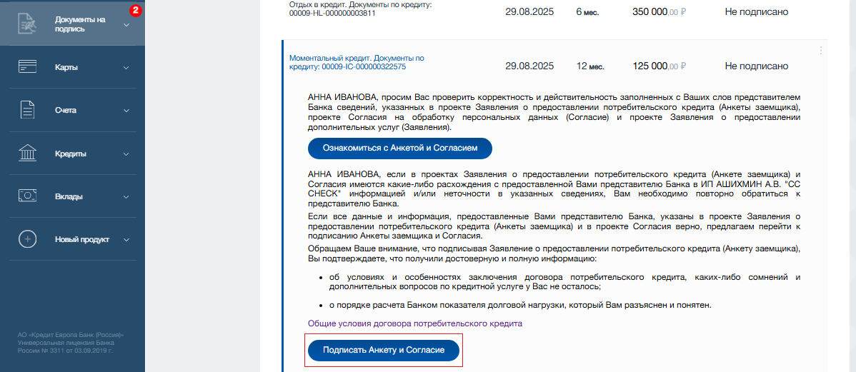Также есть возможность подачи заявки на кредит для оплаты товара/услуги партнеров при обращении к партнерам АО «Кредит Европа Банк (Россия)».