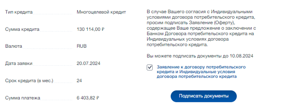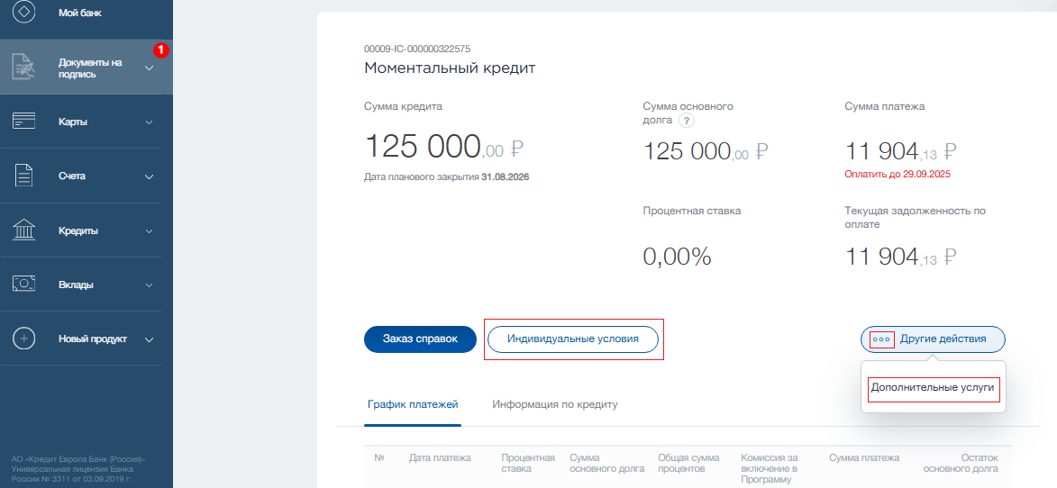 В этом разделе вы можете ознакомиться с суммой, процентной ставкой и будущим графиком платежей по предодобренному кредиту. Раздел активен при наличии предложений.