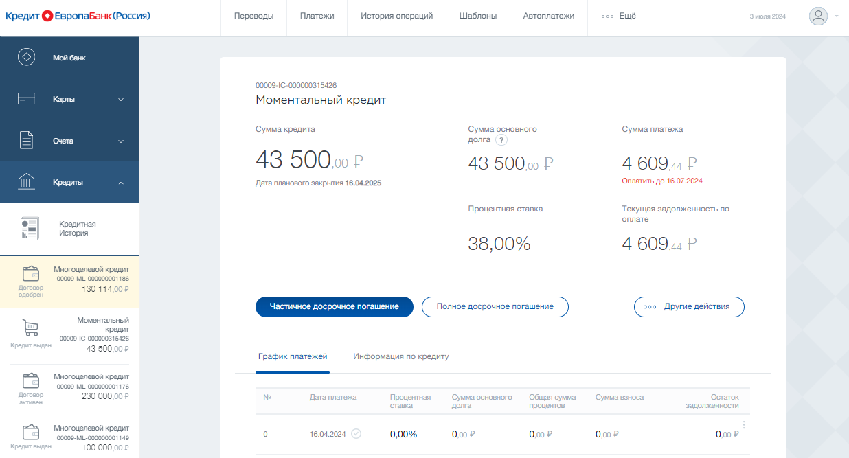 • Выбрать кредит и нажать на «График платежей».