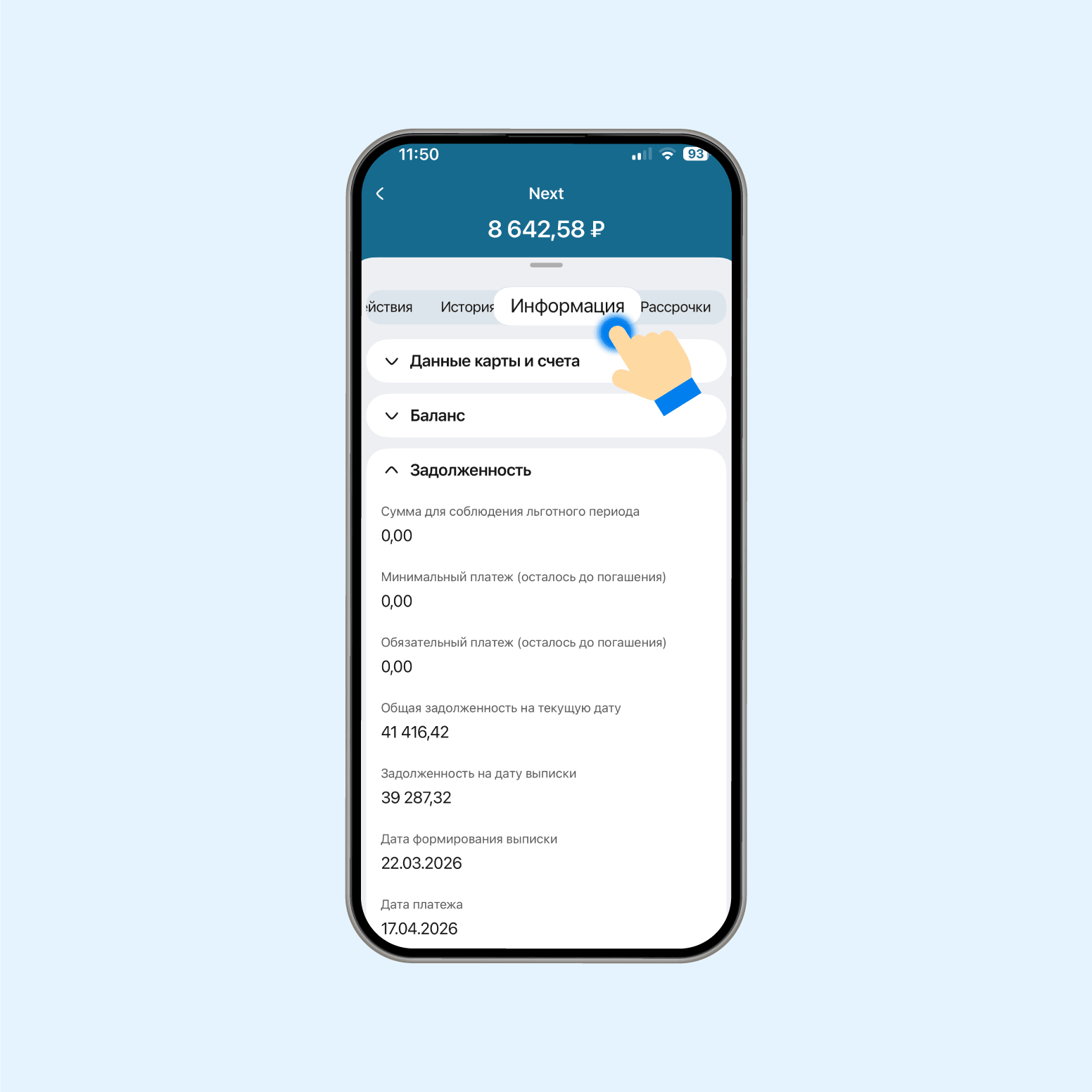 - В Мобильном банке на Главной странице в списке ваших продуктов выберите кредитную карту, по которой хотите посмотреть задолженность