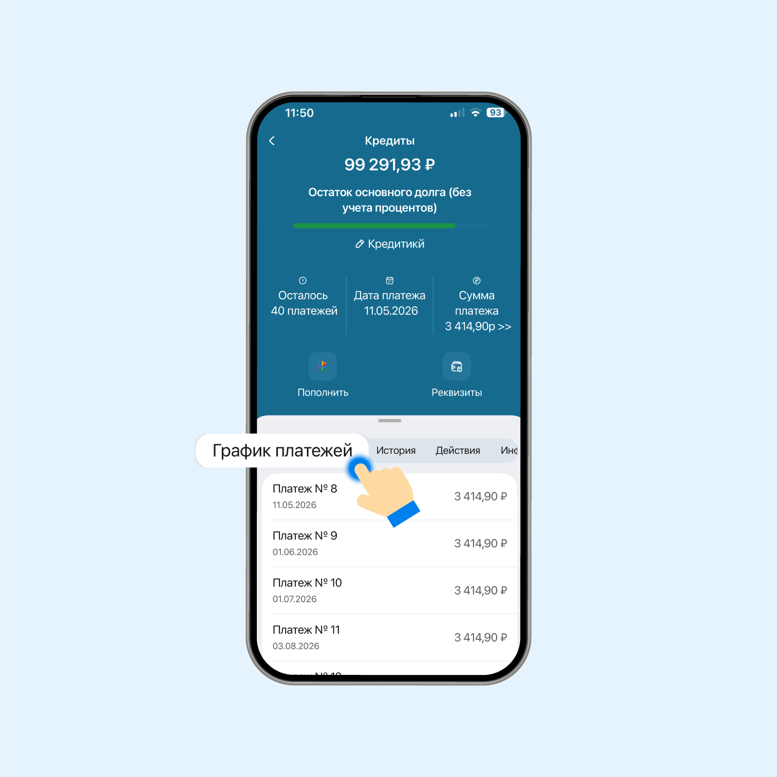 - В Мобильном банке на Главной странице в списке ваших продуктов выберите кредит, по которому хотите посмотреть график платежей